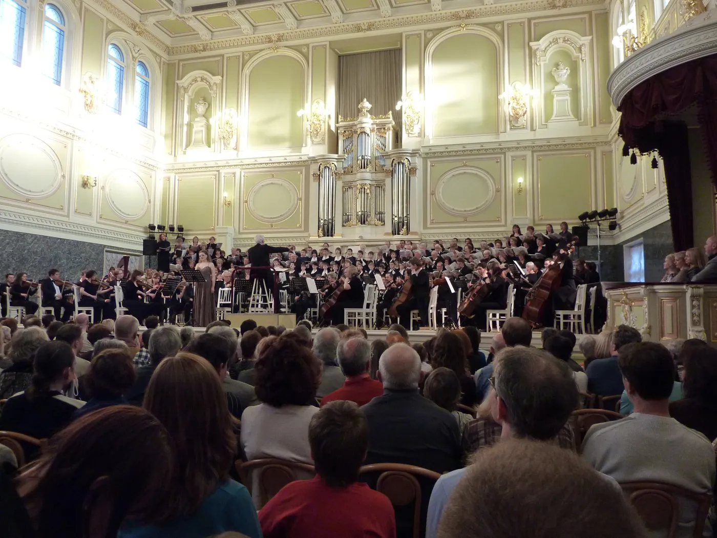 Ein ausverkaufter Konzertsaal der Academic Glinka Capella in St. Petersburg, einem Geheimtipp für Aufführungsorte mit anspruchsvoller Chormusik, direkt an der Moika im Zentrum St. Petersburgs gelegen, war uns für dieses Werk sicher. Der wunderschöne historische Konzertsaal ist benannt nach dem berühmten russischen Komponisten Mikhail Glinka (1804-1857). Es begleitete uns das Symphonieorchester St. Petersburg und es sang mit uns der berühmte Knabenchor St. Petersburg. Die Gesamtleitung hatte der bekannte russische Dirigent Edvard Serov. Ein Wermutstropfen begleitete diese Aufführung, da Edvard Serov, bereits weit über 70 Jahre alt, zum Schlussapplaus unglücklich vom Podium stürzte, sehr zu unser aller Schrecken und auch dem des Publikums. Glücklicherweise hat er sich von diesem Schock in den folgenden Tagen wieder erholt. Wir wünschen ihm weiter gute Genesung und bedanken uns für die künstlerisch wertvolle Zusammenarbeit!